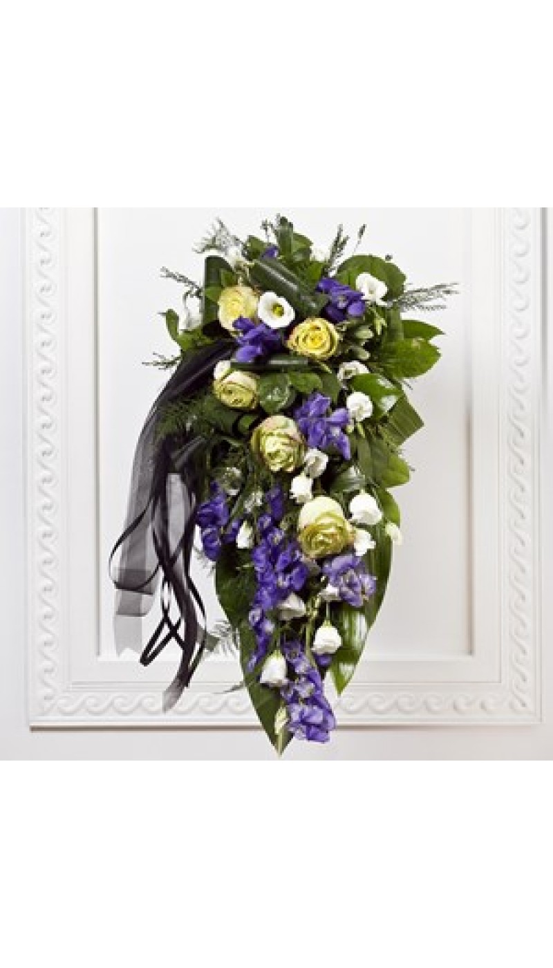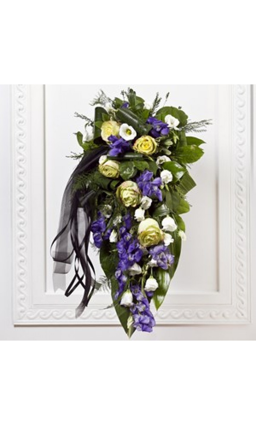 Funeral Bouquet with Blue Flowers and Ribbon